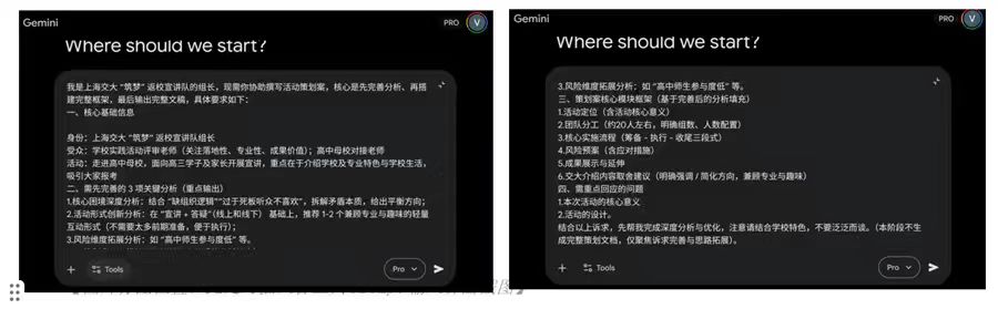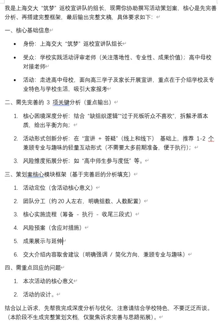 基于上述情景,测评团队设计了统一的Prompt输入各AI工具,要求其生成完整的返校宣讲策划案。