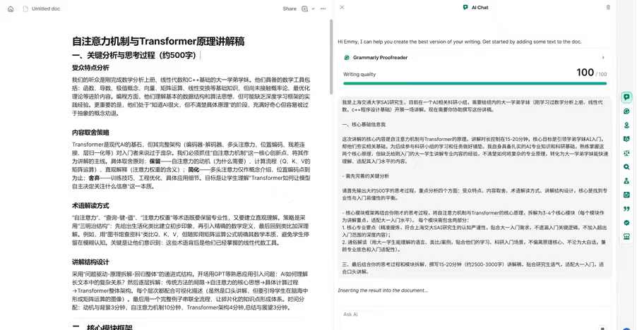 【情景复现】小思是上海交通大学SAI的一名研究生,目前在AI科研小组中指导几位大一新生。他计划利用15至20分钟,向这些刚接触过线性代数和C++的新生讲解自注意力机制与Transformer的原理,为后续科研任务奠定基础。尽管小思本人对专业知识十分熟悉,但他不确定如何将复杂理论转化为大一学生易于理解且不失专业性的内容。