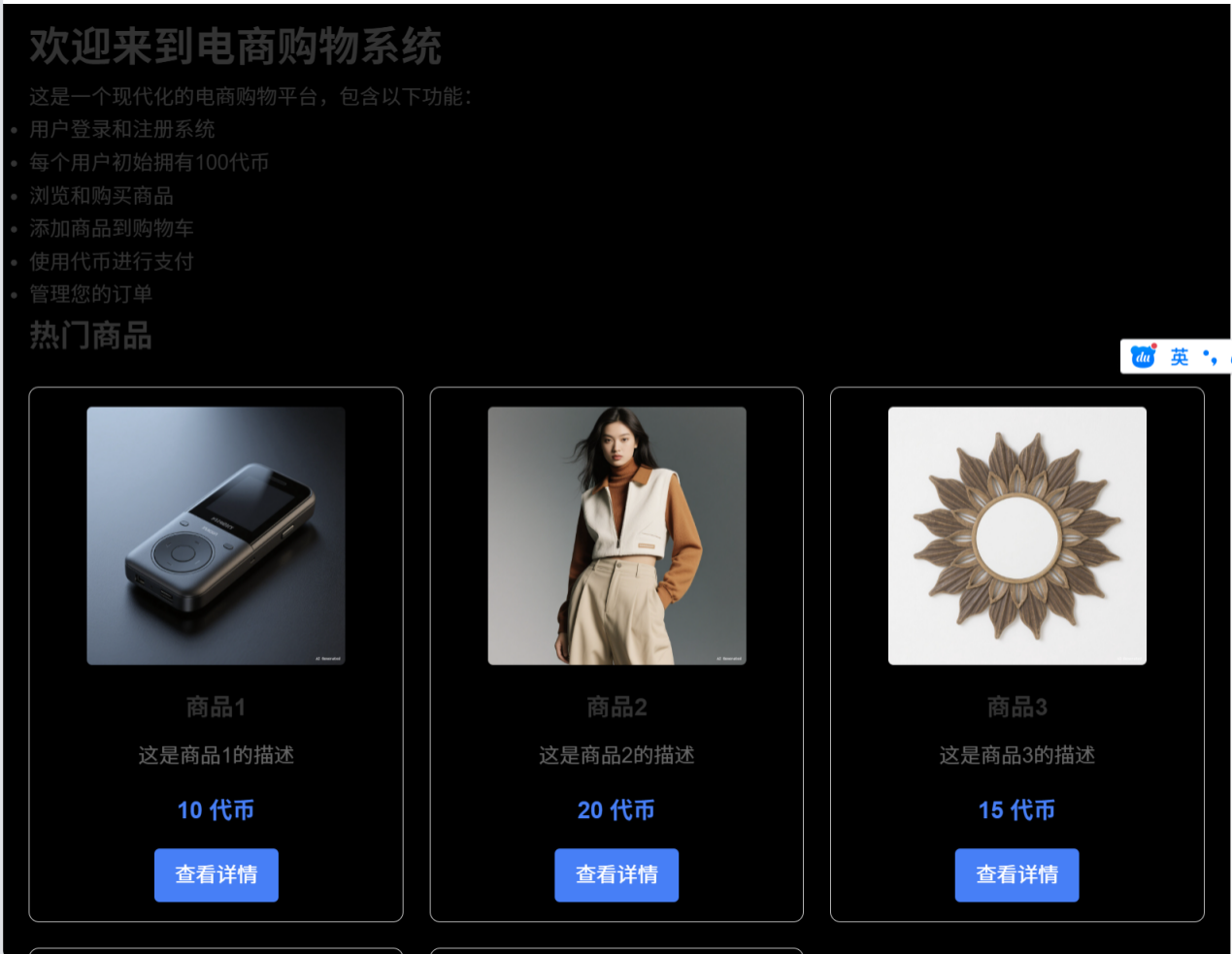 这是Trae做的电商平台这是已用虚拟账号登录的页面,可以点击商品并加入购物车,虽然画质不是很美观(原来的登录系统有问题,在多次修改后画面变难看了)