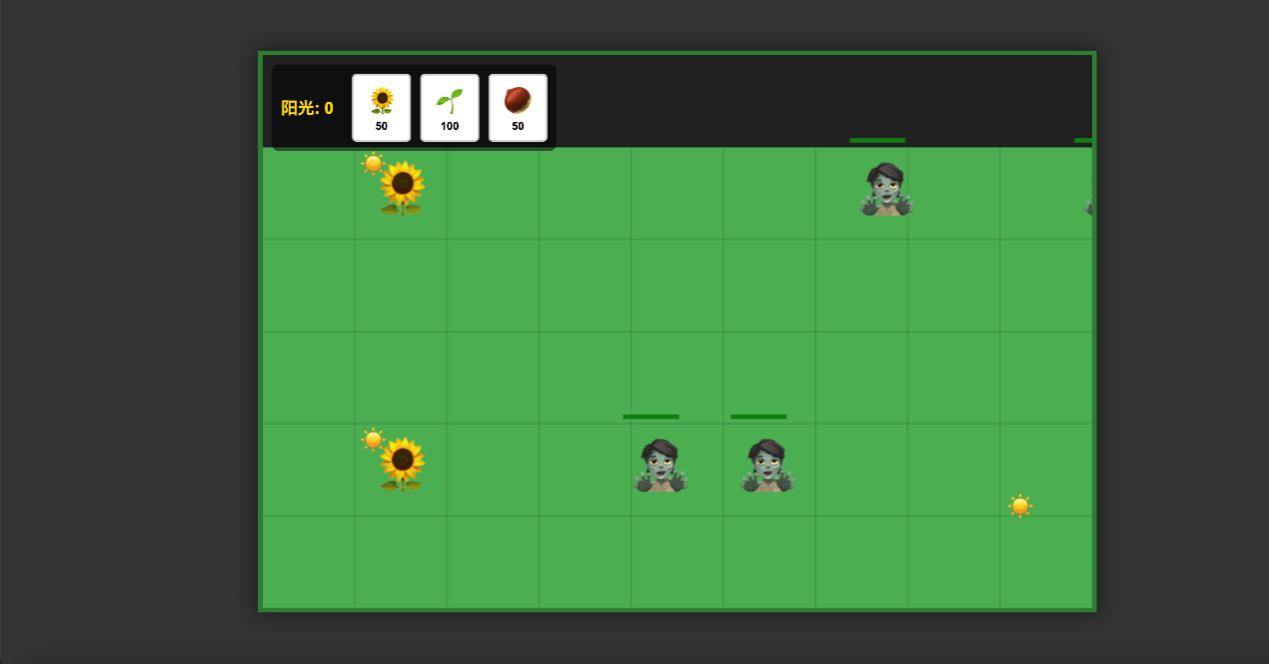 很快生成好了大致的游戏结构,但是玩法是不正确的,可以看到僵尸在距离向日葵有一段距离的时候向日葵的血量下降了,后来发现是代码逻辑错误,认为僵尸在向日葵同一行左侧就扣血,经过提示修改,效果恢复正常。