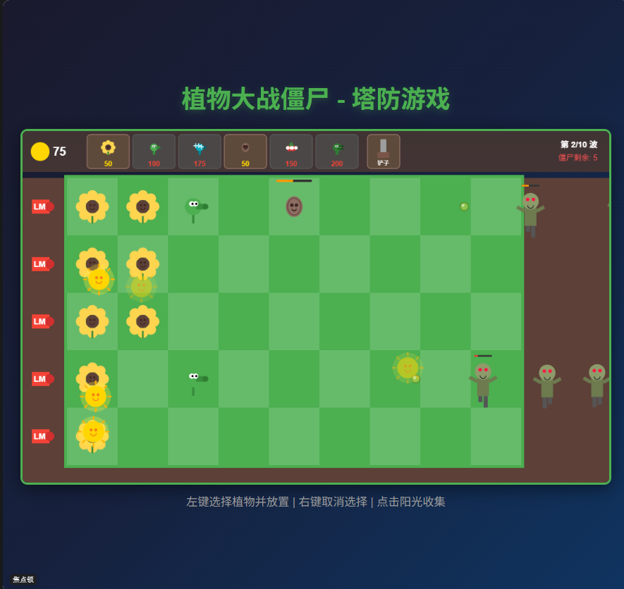 这是Trae做的植物大战僵尸,在玩家策略适当时可以顺利拿下,一开始做的在僵尸到达最左侧时只能种两个坚果,难以进行,对话后理解并按要求修改