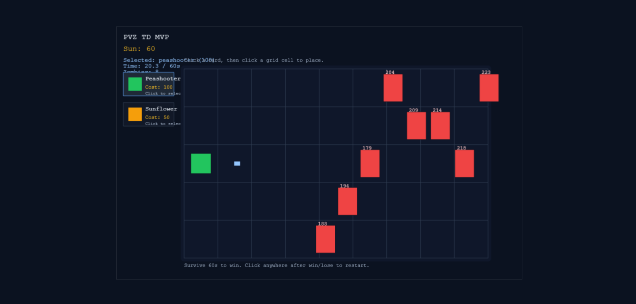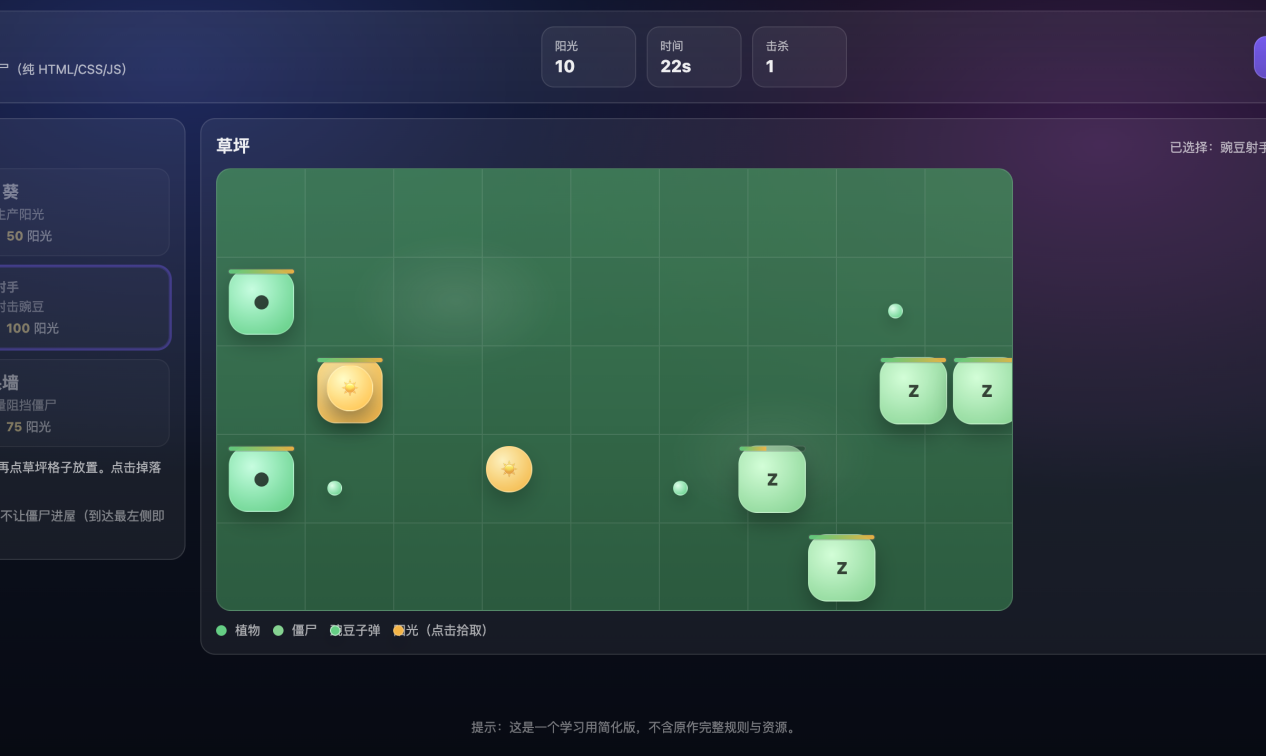 - 胜负判定:僵尸到达终点失败,全消灭胜利。