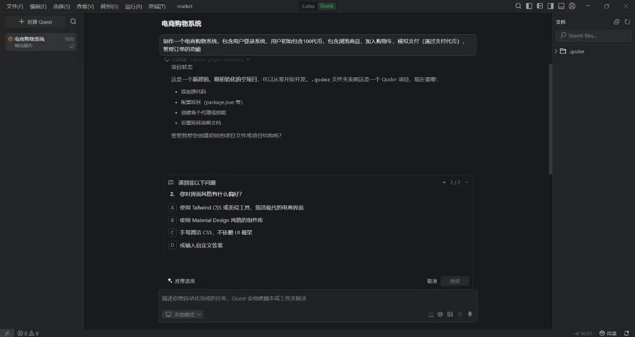 Qoder 作为纯功能实现的任务,qoder在quest模式的支持下有良好的表现,会主动生成详细工作流程,但是对任务理解不够深刻,第一次完成的时候购买物品之后库存不会减少,但是在提出bug之后迅速改正。这也体现出qoder内嵌工作流在测试方面的缺乏。