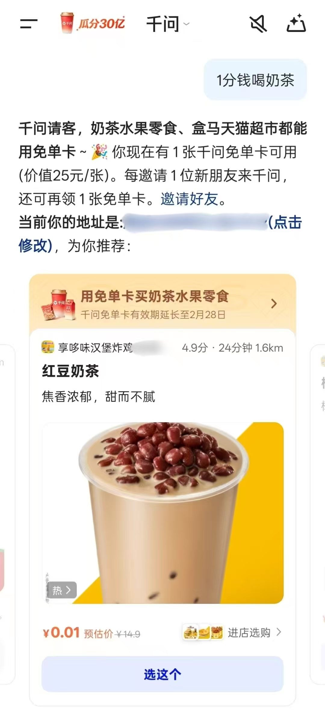但随着千问与其他企业达成合作,部分场景已突破沙盒限制、打通跨应用快捷通道。最近爆火全网、登顶热搜的“千问点奶茶”,正是这类合作落地的典型案例——用户只需发送含有关键词的简单指令,千问便能直接提供奶茶的多项选择供用户在千问界面直接下单,将跨应用操作从“教程”变成了“执行”,如下图所示: