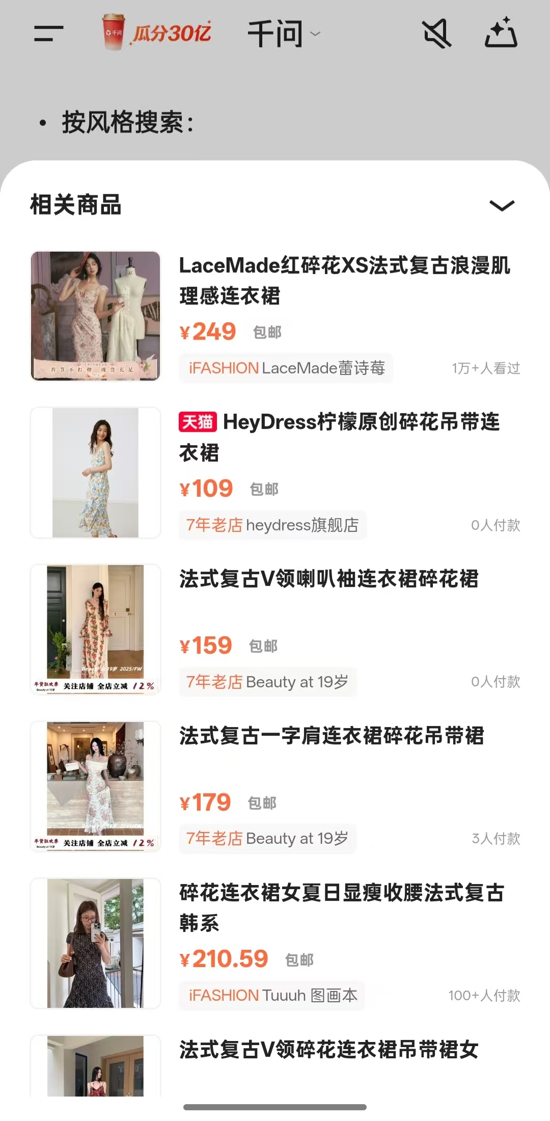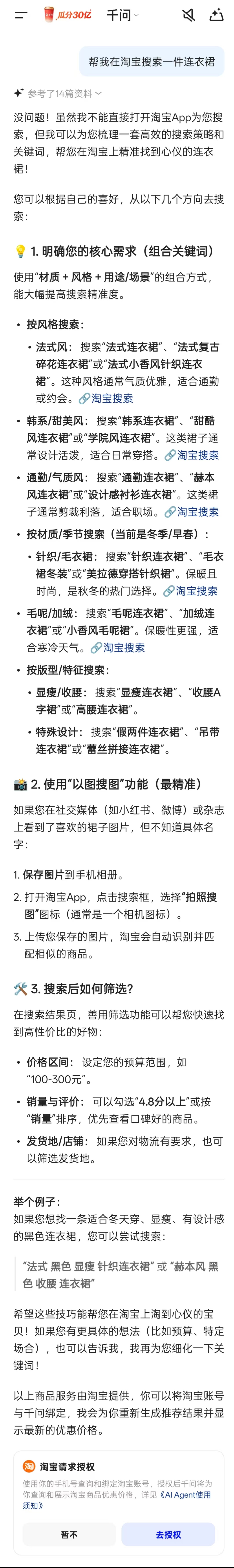 千问作为阿里巴巴旗下的AI应用,自然与淘宝率先实现深度技术整合与功能联动。在千问界面询问“帮我在淘宝搜索一件连衣裙”,千问会弹出一串带有链接的文字,点进相应链接无需跳转淘宝就可以看到对应连衣裙的界面。同时,千问在回答末尾会弹出“淘宝申请授权”的提示框,完成授权后就可以直接在当前界面下单,具体操作页面可见下列两图。