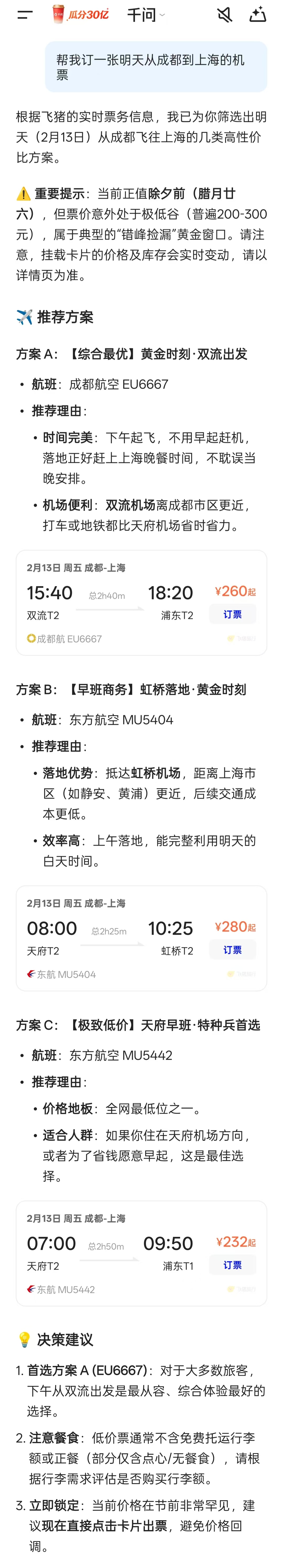 在图片中,可以看到千问给出了多项选择,而点击卡片右侧的“订票”就可以直接购票,操作十分便捷。