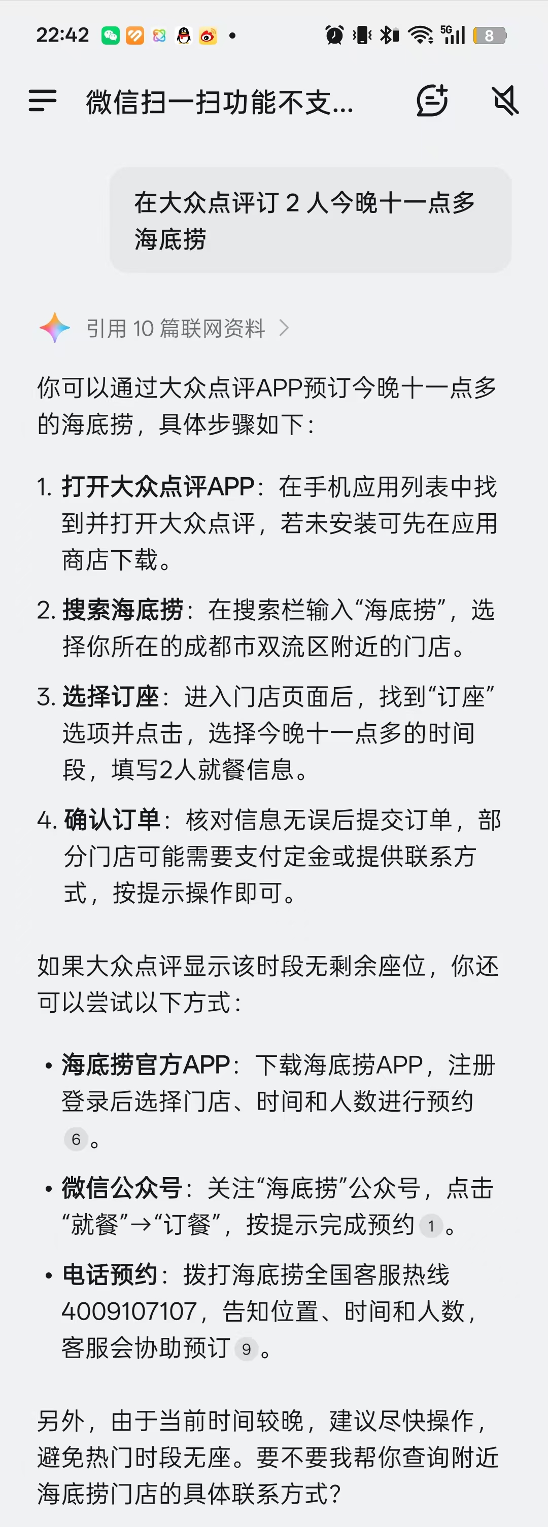 无法完成大众点评订餐的功能,会输出文字引导用户按文字步骤操作。