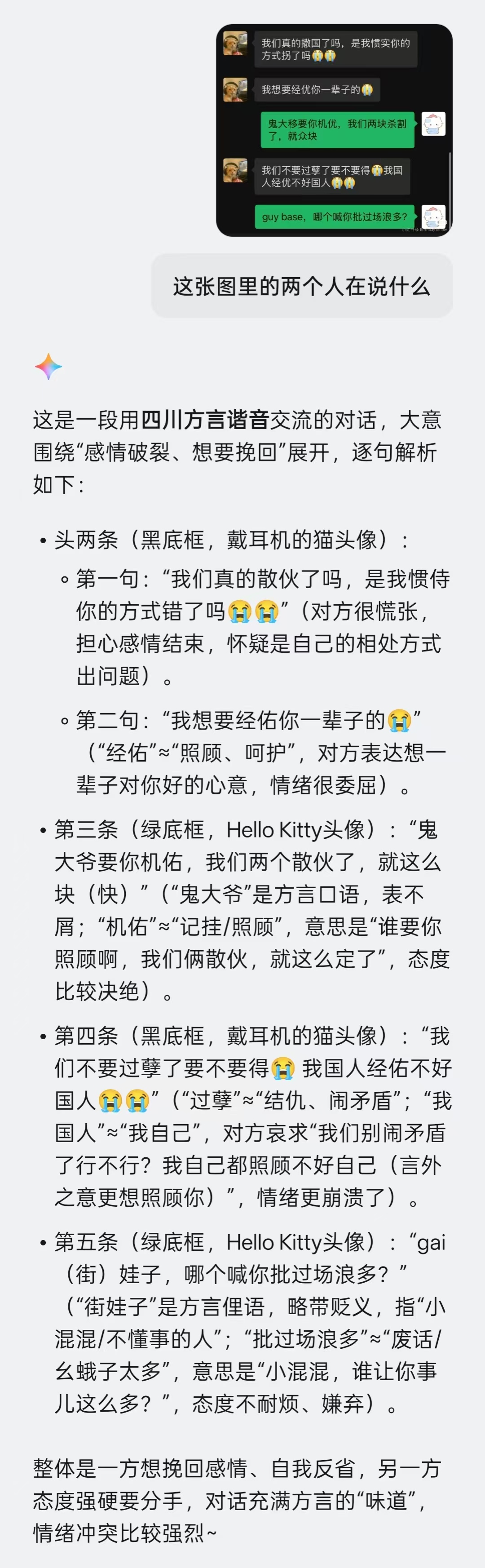 可以识别方言的种类并能听懂简单的方言。对于四川方言的词语,大致理解准确,但少量词语的释义出现了偏差,对于方言和谐音叠加的网络流行语言无法识别,且对该对话的幽默内核理解错误,只能看出表面的“情绪冲突”。对于粤语的词语理解能力相比之下会好很多,且由于对话中的感情更直接故理解较为精准。