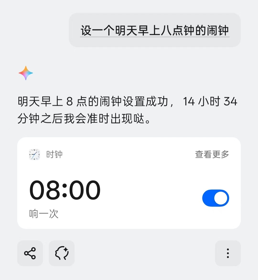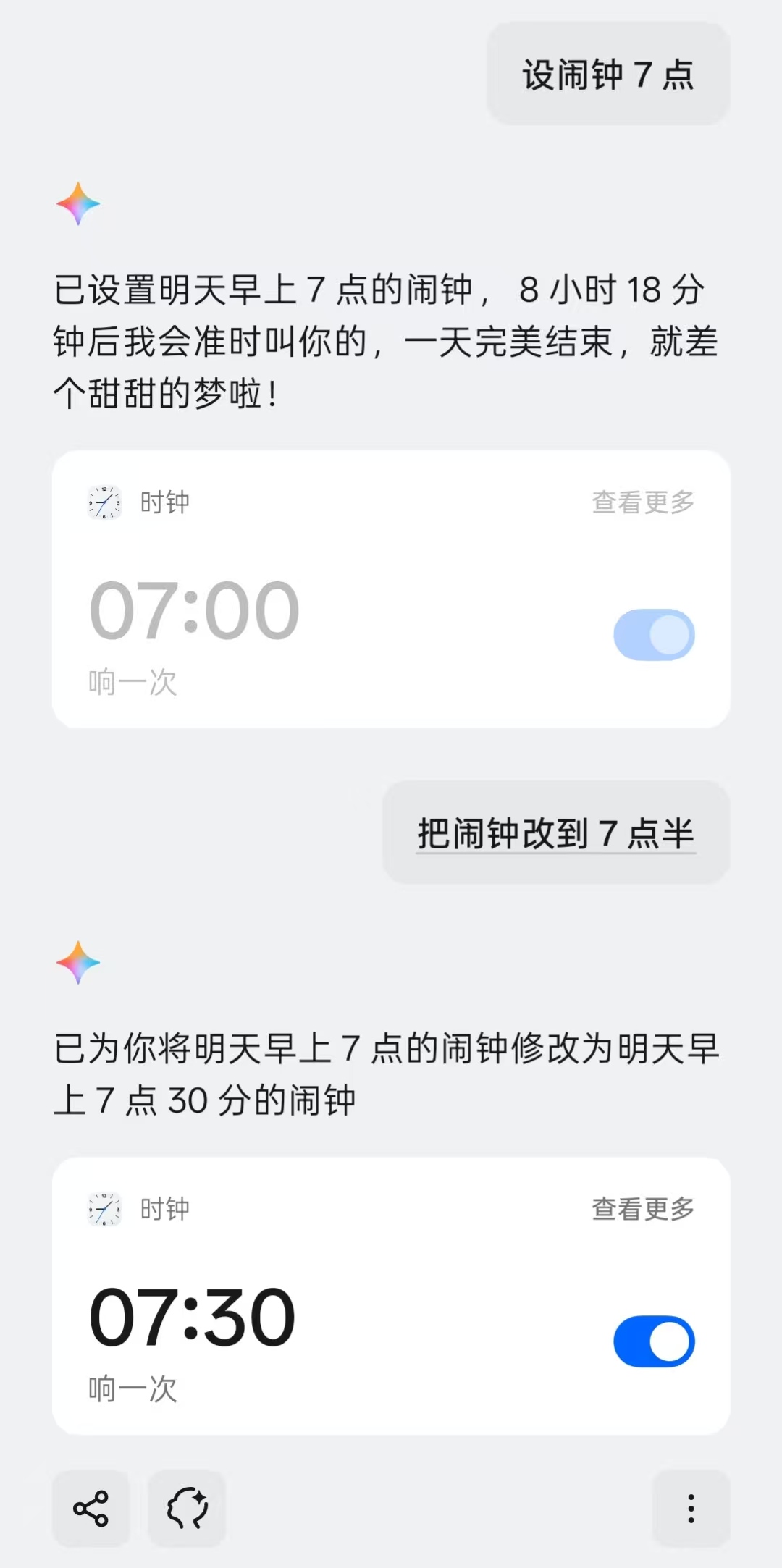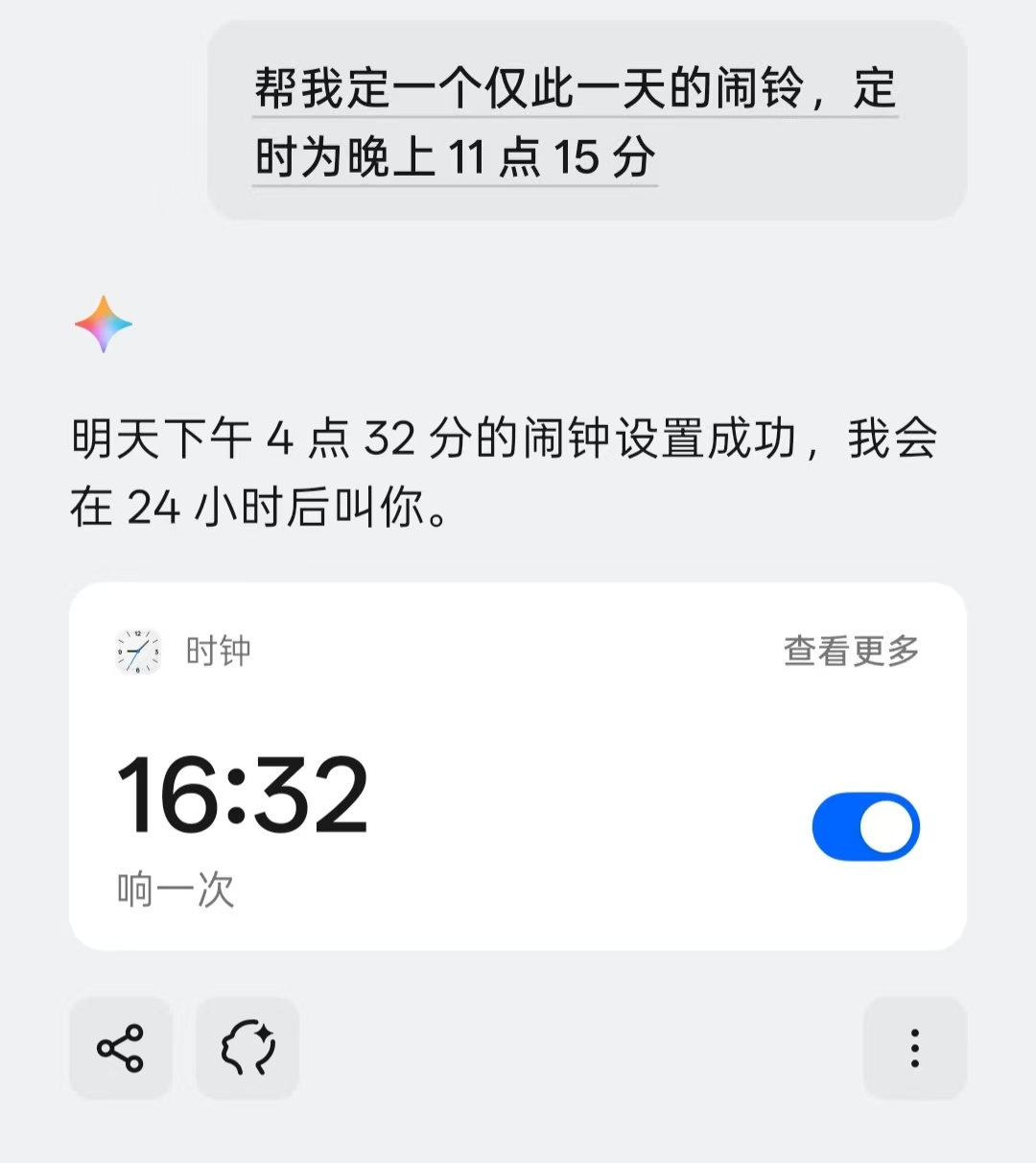 小布助手对于简单的多轮对话具有理解能力,并对上一轮对话具有简单的记忆能力。但对于设定闹钟这类简单操作的不同指令理解存在偏差,当输入最简单指令时能正确理解,但当单轮指令变得稍复杂后会出现错误,如下图所示: