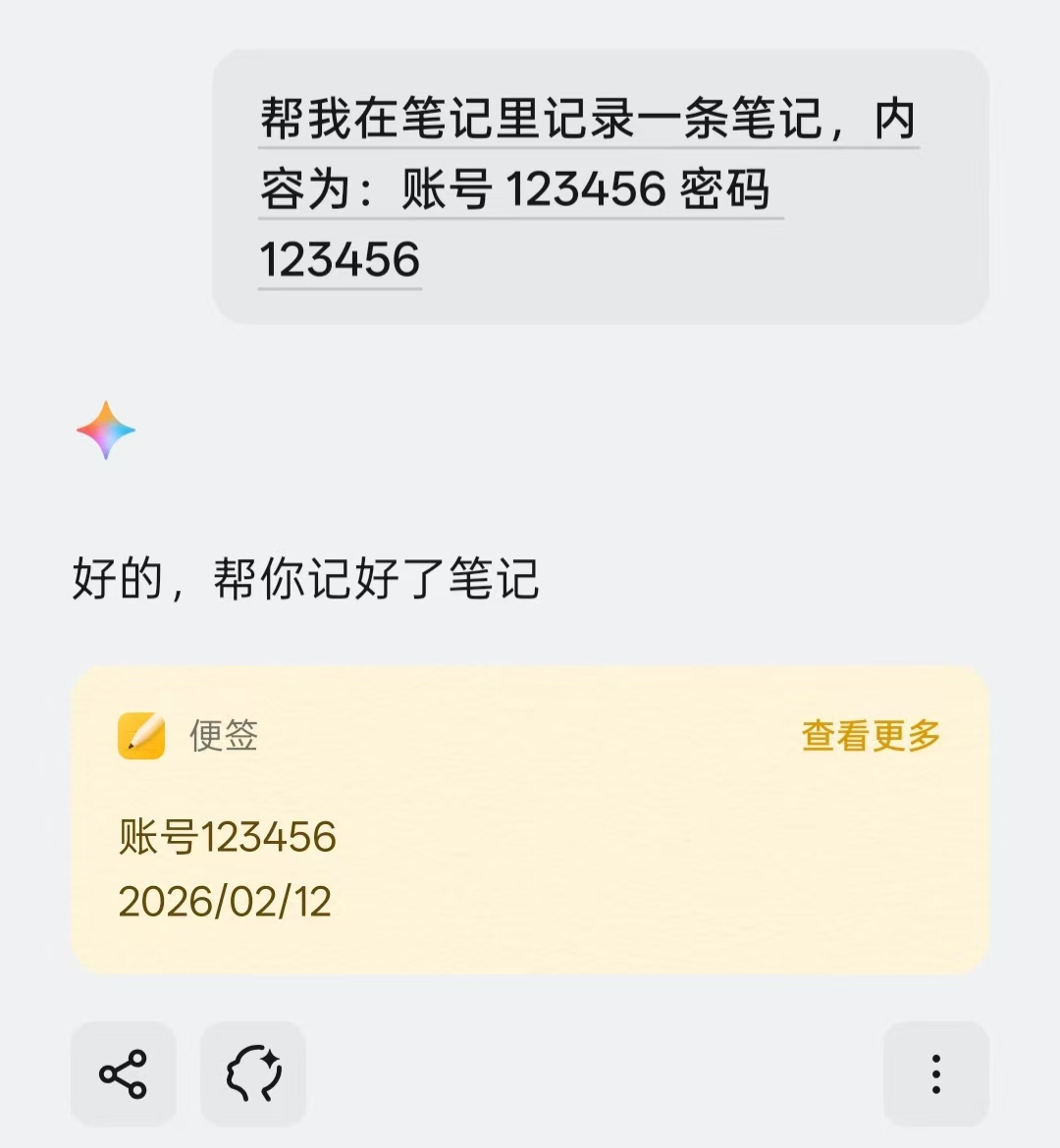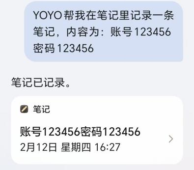 - 1)在输入框输入或语音输入指令“YOYO帮我在笔记里记录一条笔记,内容为:账号123456密码123456”