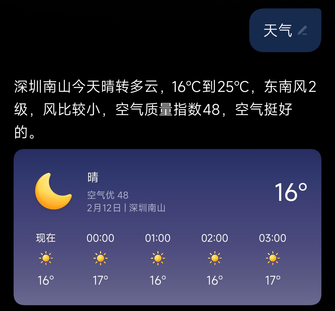 简述了天气状况,并生成了一张天气卡片,点击可进入系统自带的“天气”应用。注:需开启定位权限。