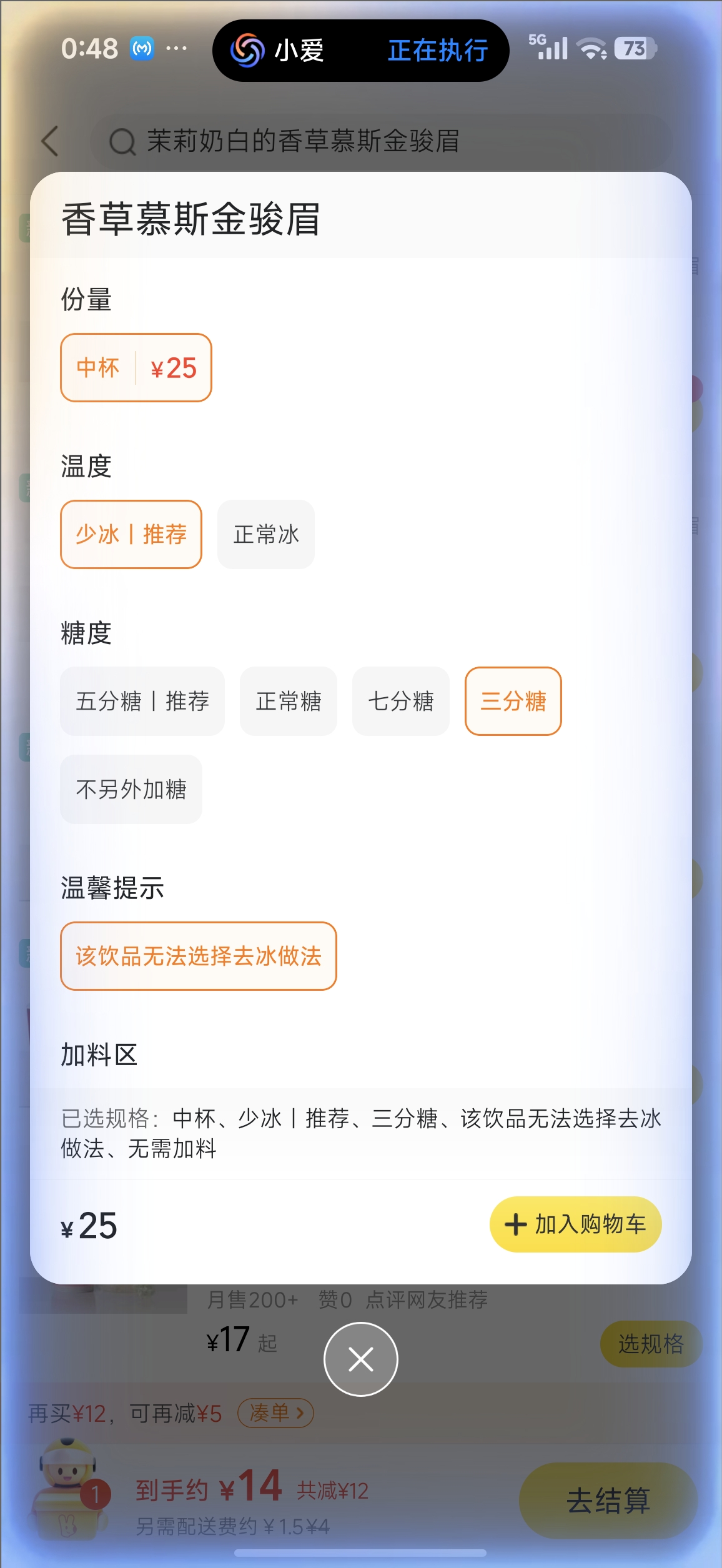 1)语音输入/键入“在美团预订一杯饮品外卖,茉莉奶白的香草慕斯金骏眉,少冰三分糖,时间明天上午十一点”