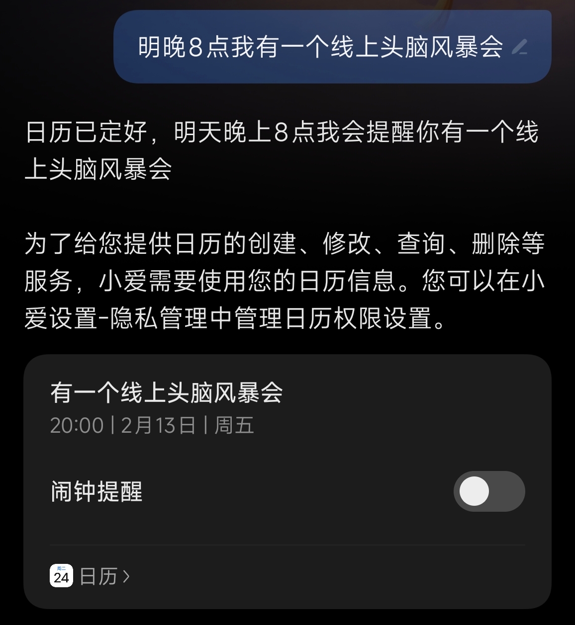 点评:用户并未明确提出指令,小爱识别到了日程安排需求,并提取信息完成了任务。但事件提取比较粗糙,事件标题为用户原话复制,不够简洁明了。