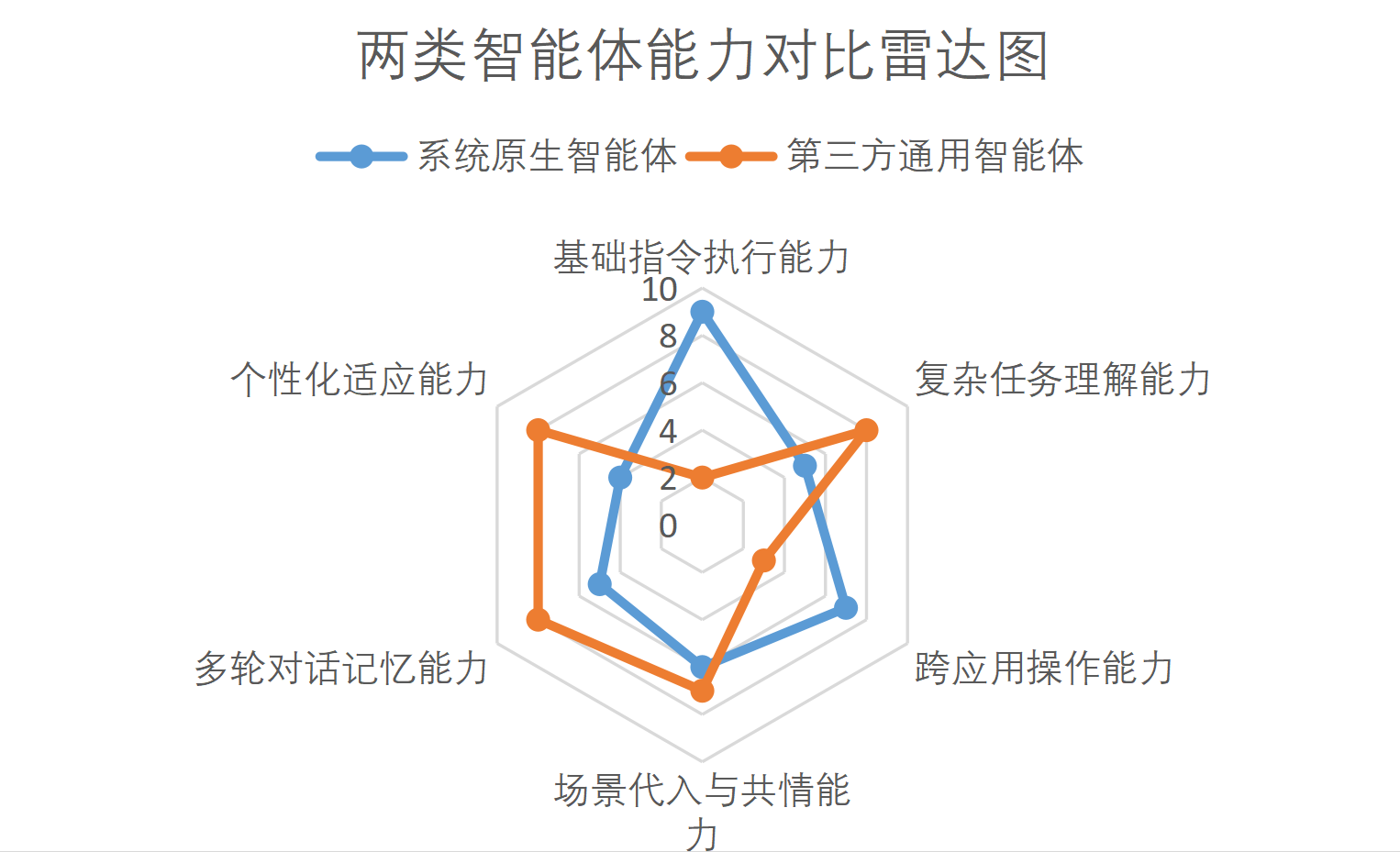 以下是一个结合了多轮测试得到的两类智能体在各维度能力的示意图:(评分基于多轮实测得出,旨在呈现相对差异,非绝对精度指标)