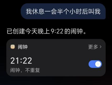- 1)在输入框输入或语音输入指令“我休息一会儿,半个小时后叫我”