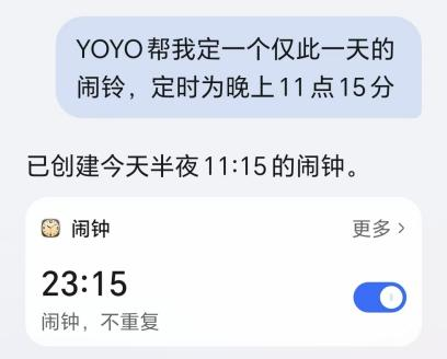 - 2)在输入框输入或语音输入指令“YOYO帮我设定仅此一天的闹钟,定时为晚上的11点15分”