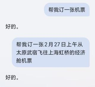 - 2)继续完善指令“帮我订一张2月27日上午从太原武宿飞往上海虹桥的经济舱机票”